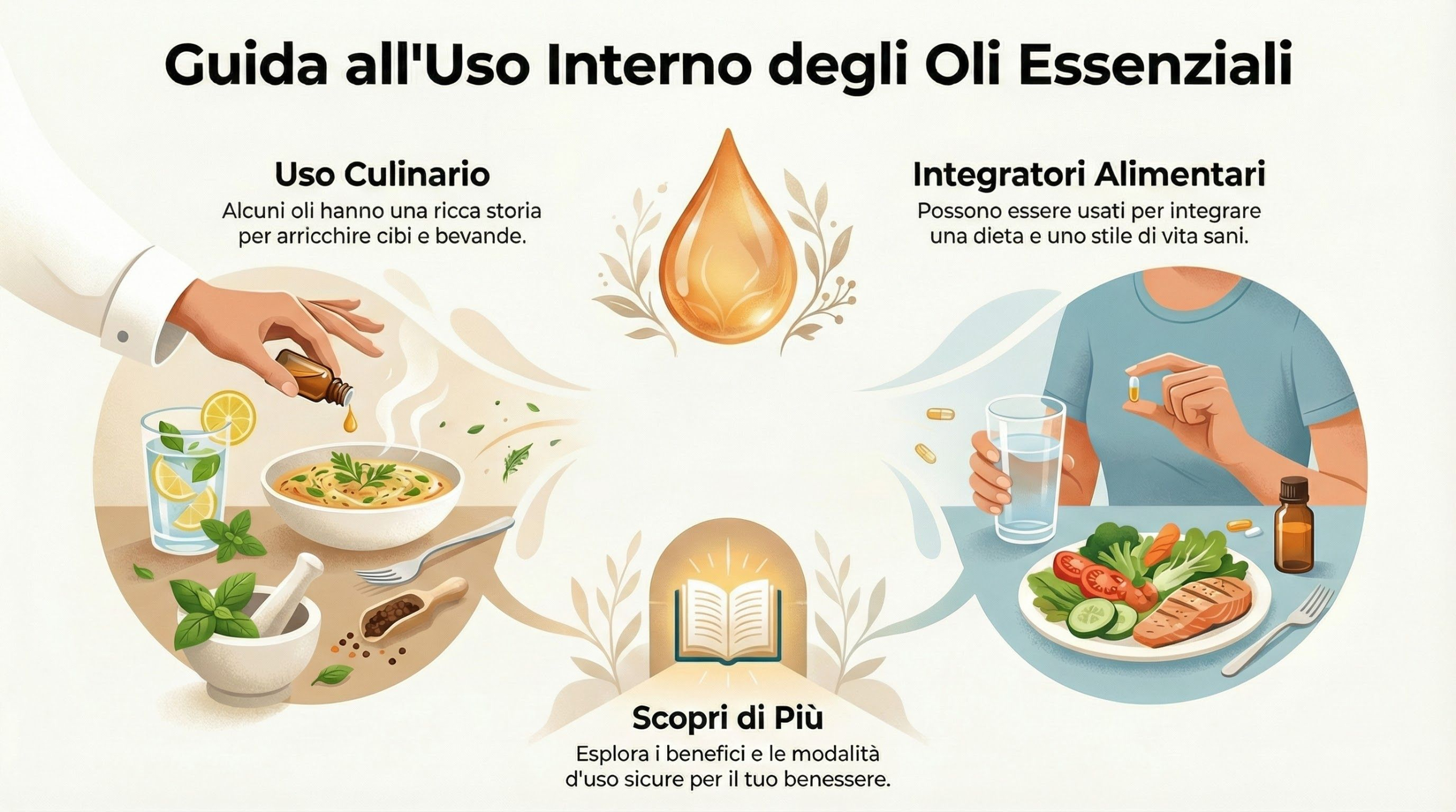 Da secoli, proprio grazie alle loro caratteristiche uniche, gli oli essenziali vengono utilizzati in modo tradizionale per aromatizzare alimenti, per la cura della persona e come supporto al benessere quotidiano.