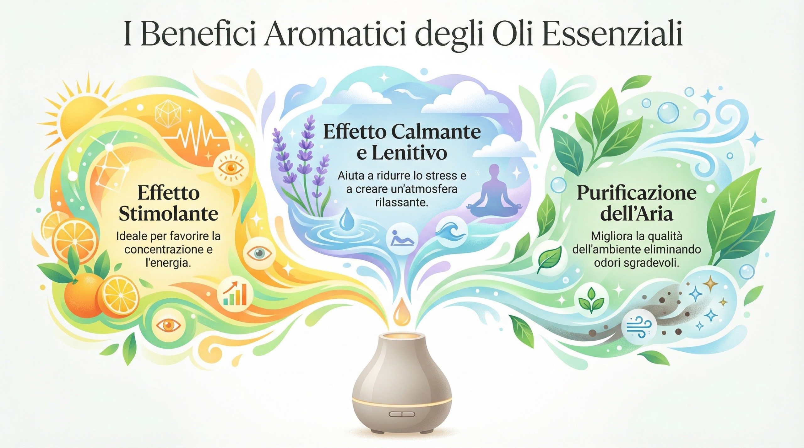 Molti Oli Essenziali, quando diffusi, possono essere stimolanti, calmanti e lenitivi, ma anche purificanti dell'aria.